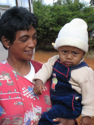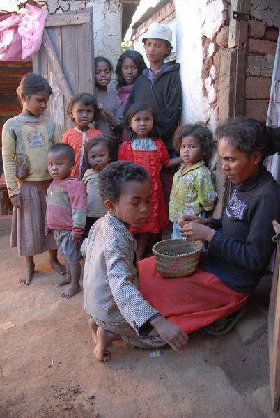 Je vais aussi vous parler de notre petit couple : le grand père aveugle et sa femme. Je n’ai pas de photo 2010 à vous montrer car il aurait été indécent de prendre des photos de notre petit papa squelettique, mourant au premier étage (où l’on accède par une échelle) de sa mini-maison à la campagne (à 4h de marche d’Antsirabe). Il ressemble à ces vieilles photos des hommes prisonniers des camps de concentration de la 2e guerre mondiale. Couché à même le sol, malade depuis le mois de février, il n’arrive pratiquement plus à s’alimenter. Sa petite femme, court partout et s’occupe de lui, heureusement qu’elle a un courage et un enthousiasme époustouflant, elle est son dernier petit rayon de soleil… Il a refusé que nous l’emmenions en voiture jusqu’à l’hôpital, il souhaite mourir chez lui… Bonjour tristesse.