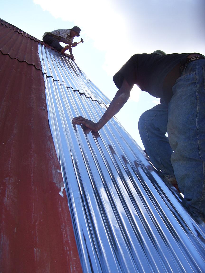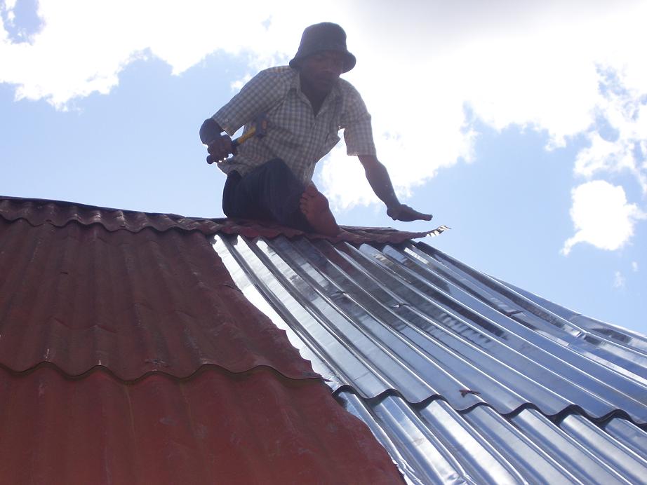 Pendant ce temps, et ce malgré les pluies et orages abondants, les travaux se poursuivent et avancent à Fahitana. Quelques photos des travaux du toit : remplacement des tôles, peintures, soubassement en bois…